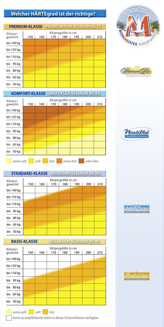 Den folgenden Tabellen können Sie – je nach Schaumqualität – den für Ihre Körpermaße empfohlenen Härtegrad entnehmen – aufgeteilt in die vier Schaumklassen: